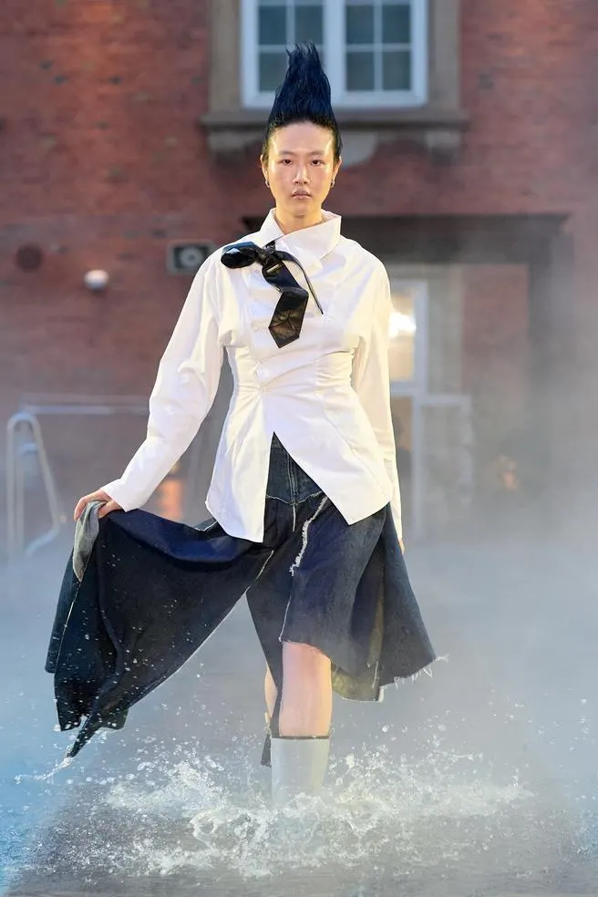Jednym z najbardziej zapadających w pamięć pokazów był ten przygotowany przez Deadwood. Wybieg stanowił bowiem basen hotelowy, a modele przemierzali go w stylizacjach inspirowanych morskimi podróżami i „rozbitkami na wybrzeżu”. Pokaz zdominowały asymetryczne koszule, sprane t-shirty, postrzępione materiały i oversize’owe sylwetki, które nawiązywały do surowego, morskiego klimatu. Największą gwiazdą kolekcji była jednak współpraca Deadwood z marką Tretorn – gumowe buty przeciwdeszczowe, które doskonale komponowały się z wodnistym wybiegiem.
